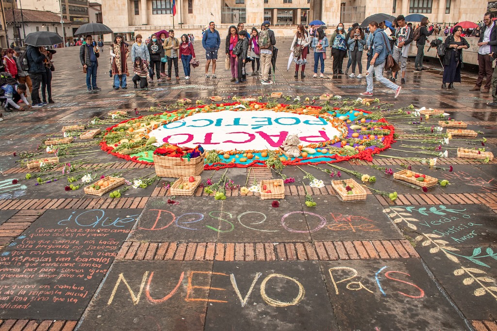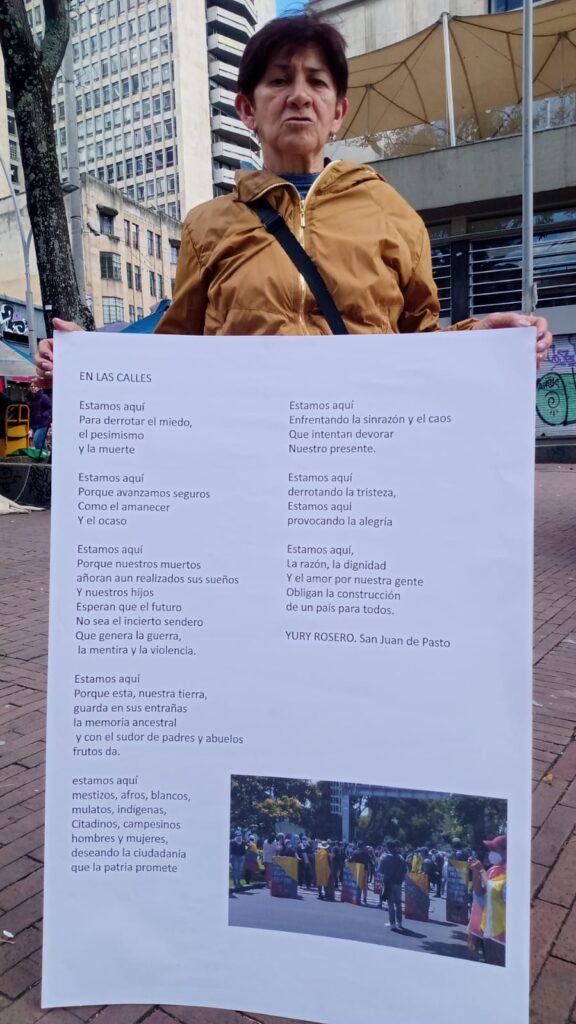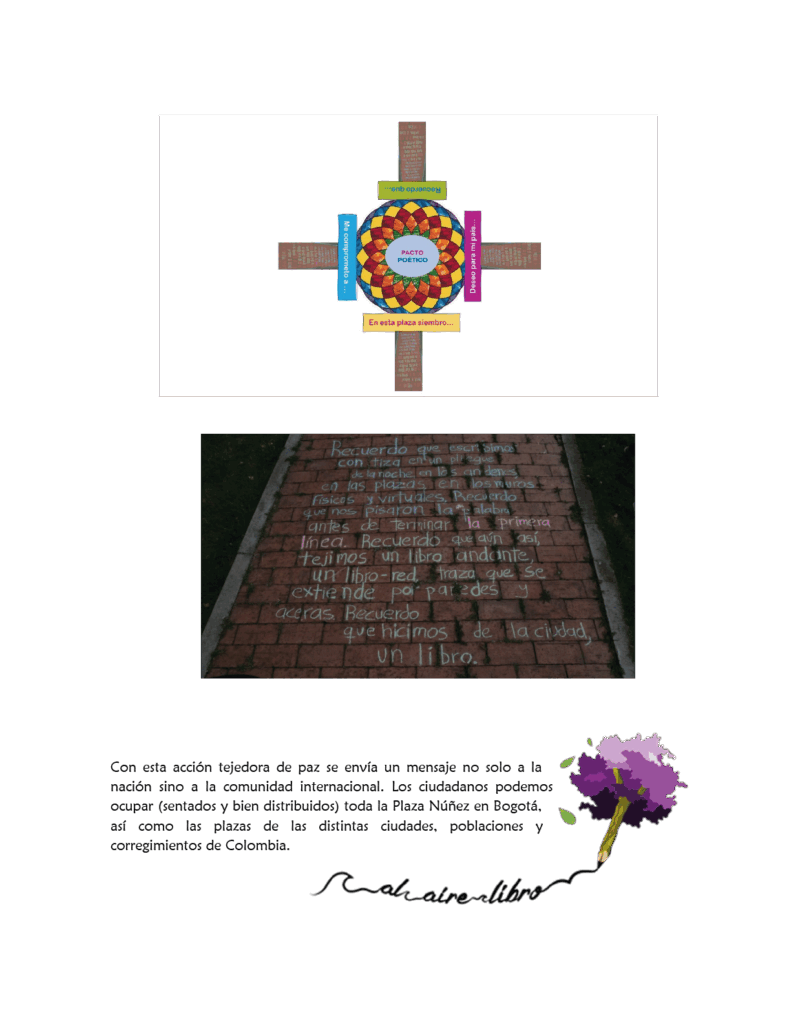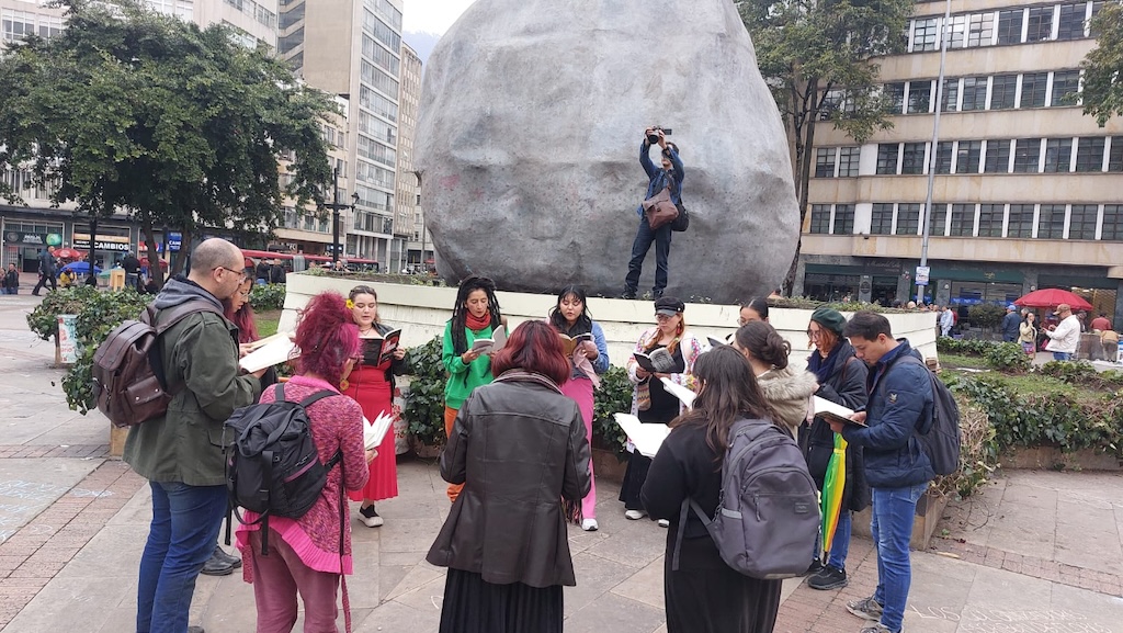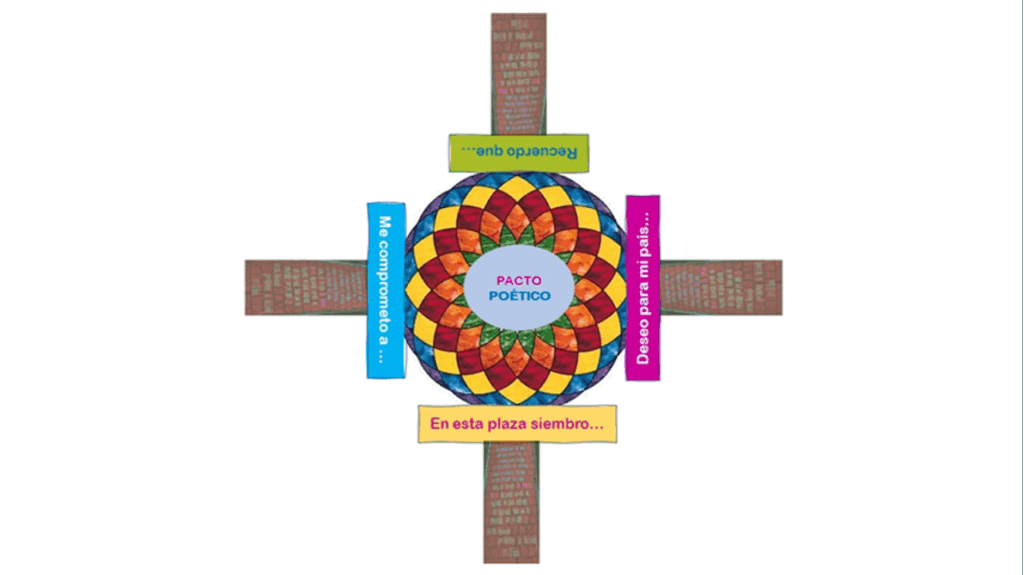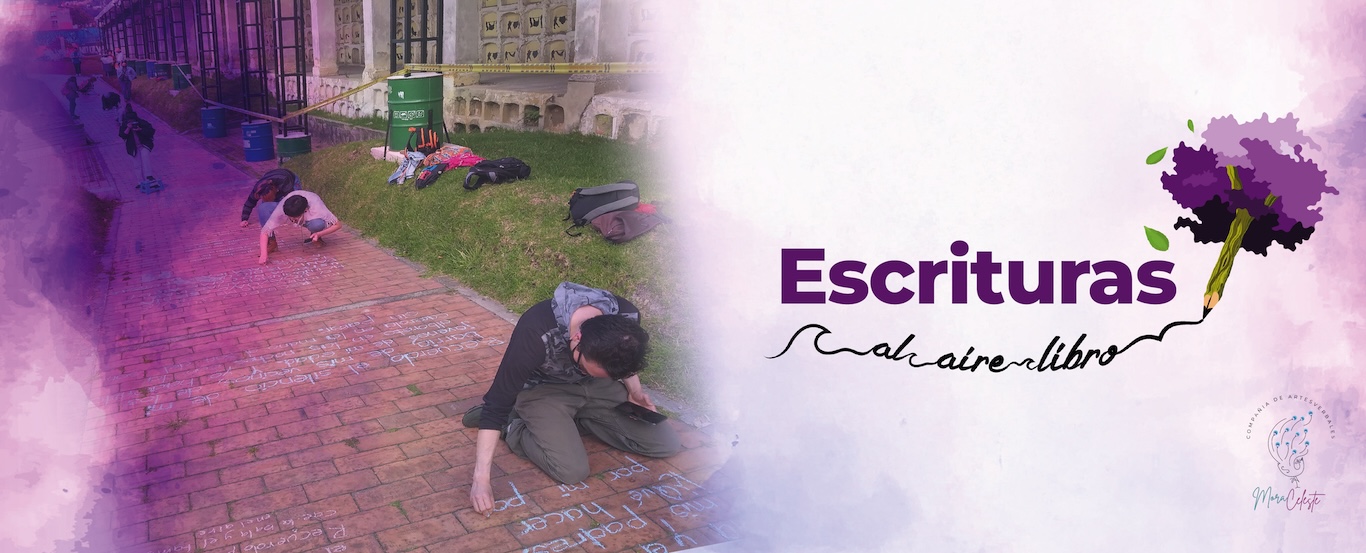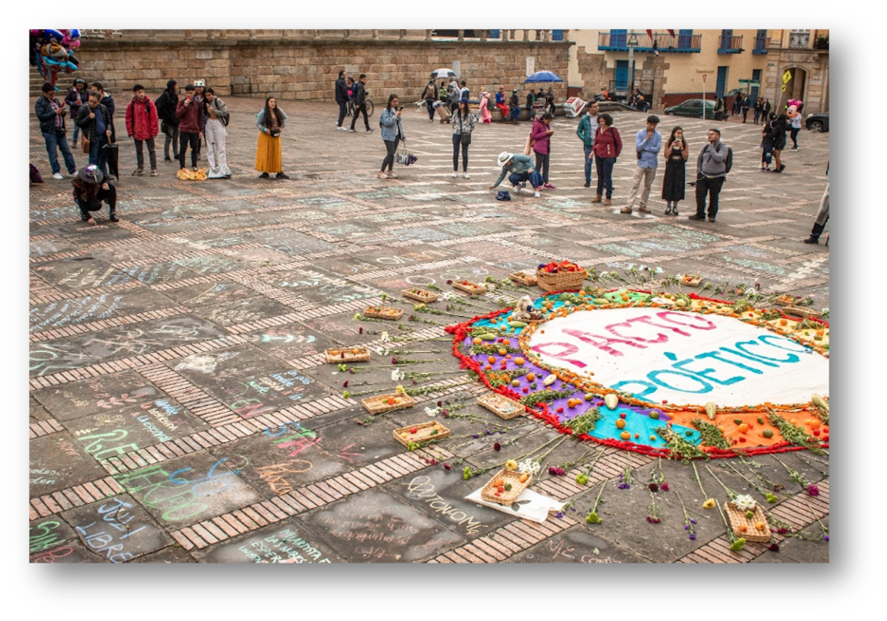 En 2022, la acción de escrituras colectivas efímeras se llevó a cabo en el marco del estallido cultural convocado por Ministerio de Cultura de Colombia. En esta ocasión elaboramos un diseño empleando los cuatro puntos cardinales para intervenir con escritura la Plaza de Bolívar de Bogotá.