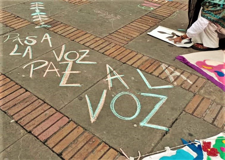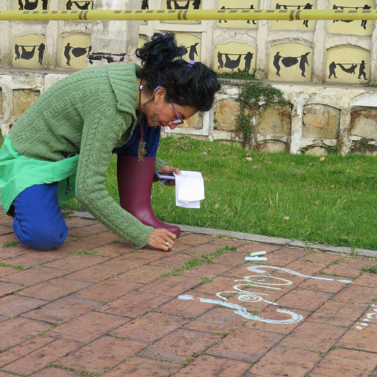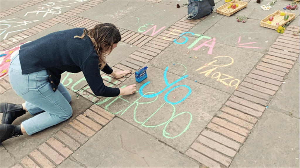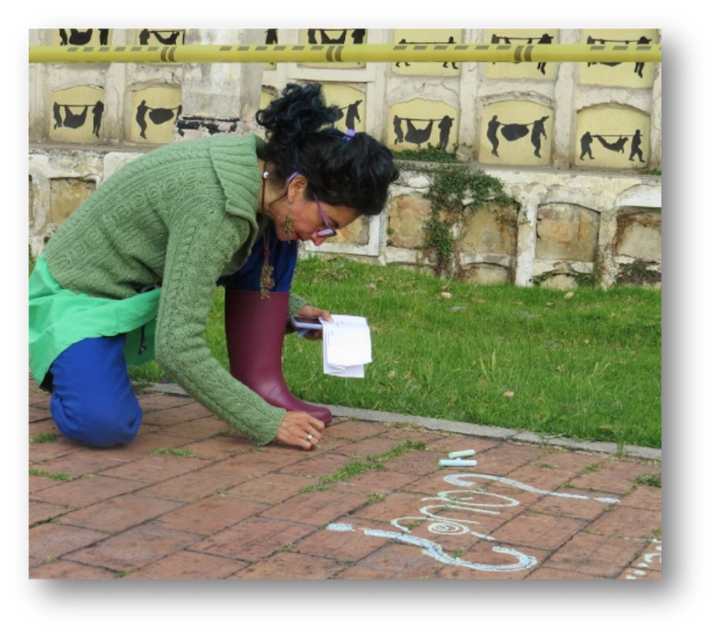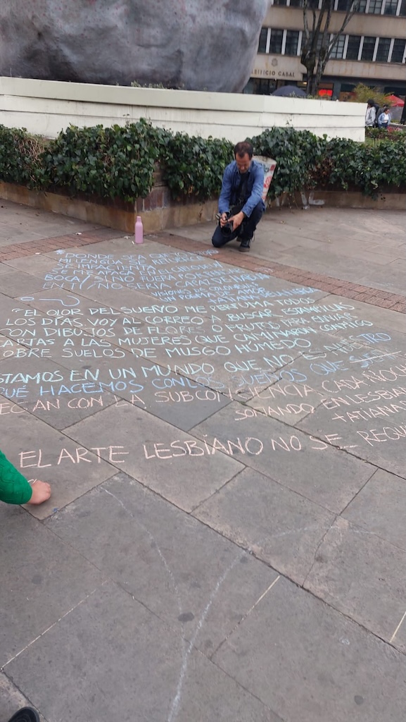 Nos propusimos generar participación a través de la escritura creativa efímera y colectiva, apoyadas en ejercicios anteriores de creación desde las escrituras expandidas con un enfoque incluyente que permite dar la palabra desde la escritura (con tiza, en este caso), a otras, otros y otres. Así mismo, con el planteamiento de esta acción buscamos recoger memorias en torno a la Plaza de Bolívar, generar proyecciones y compromisos desde la escritura poética.