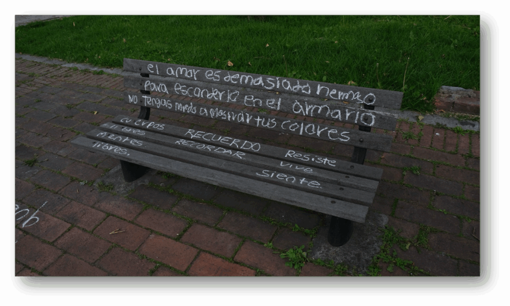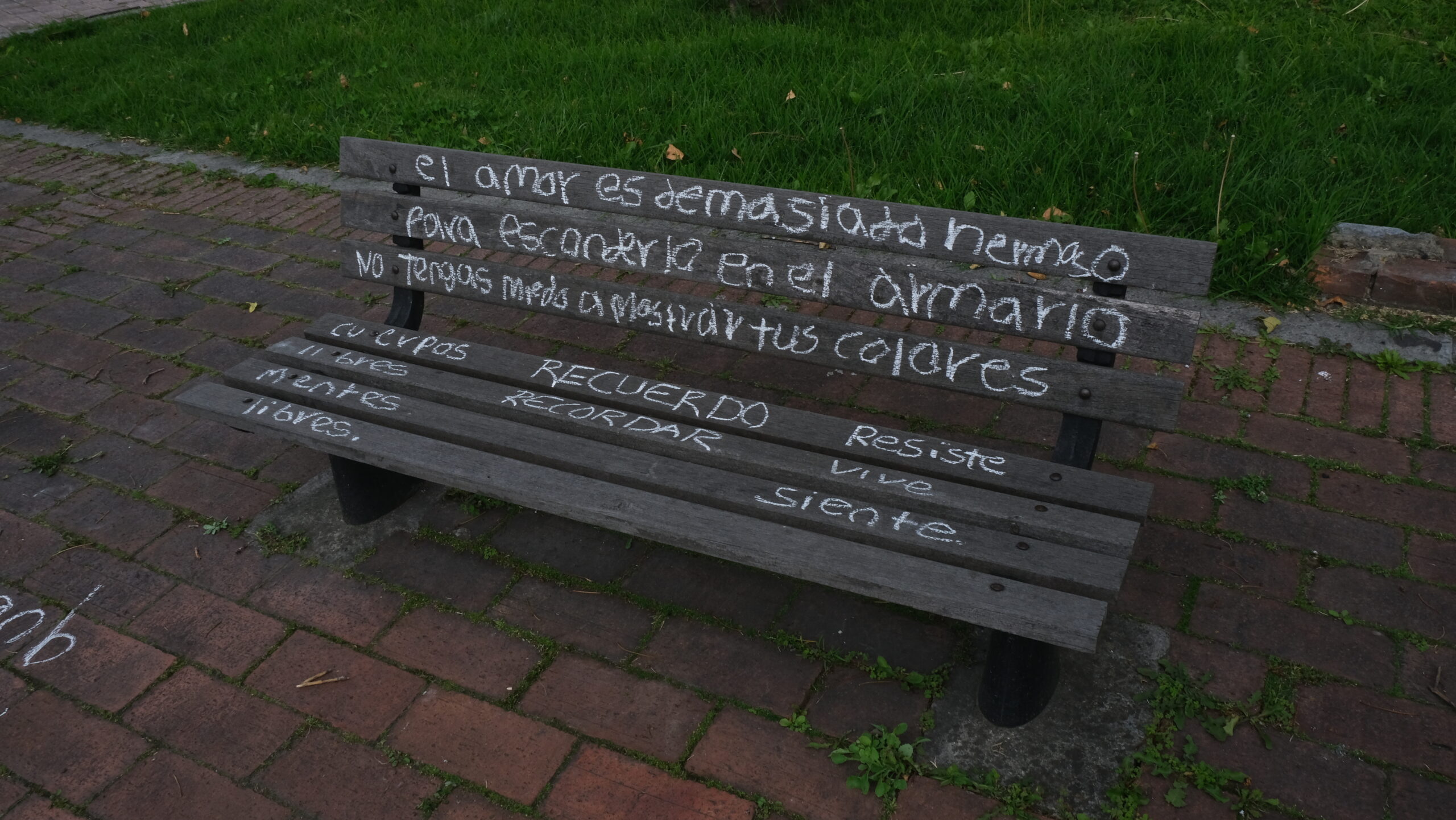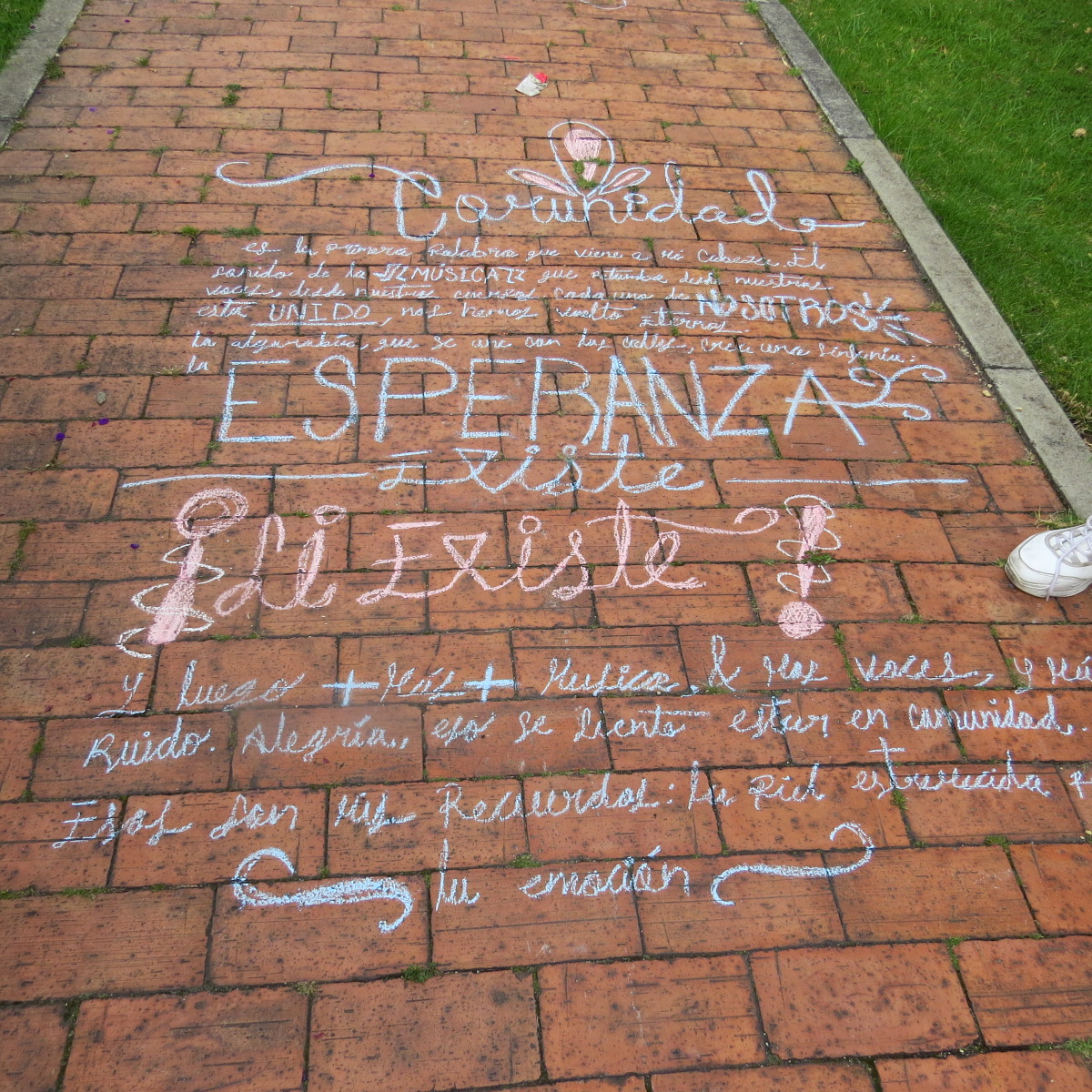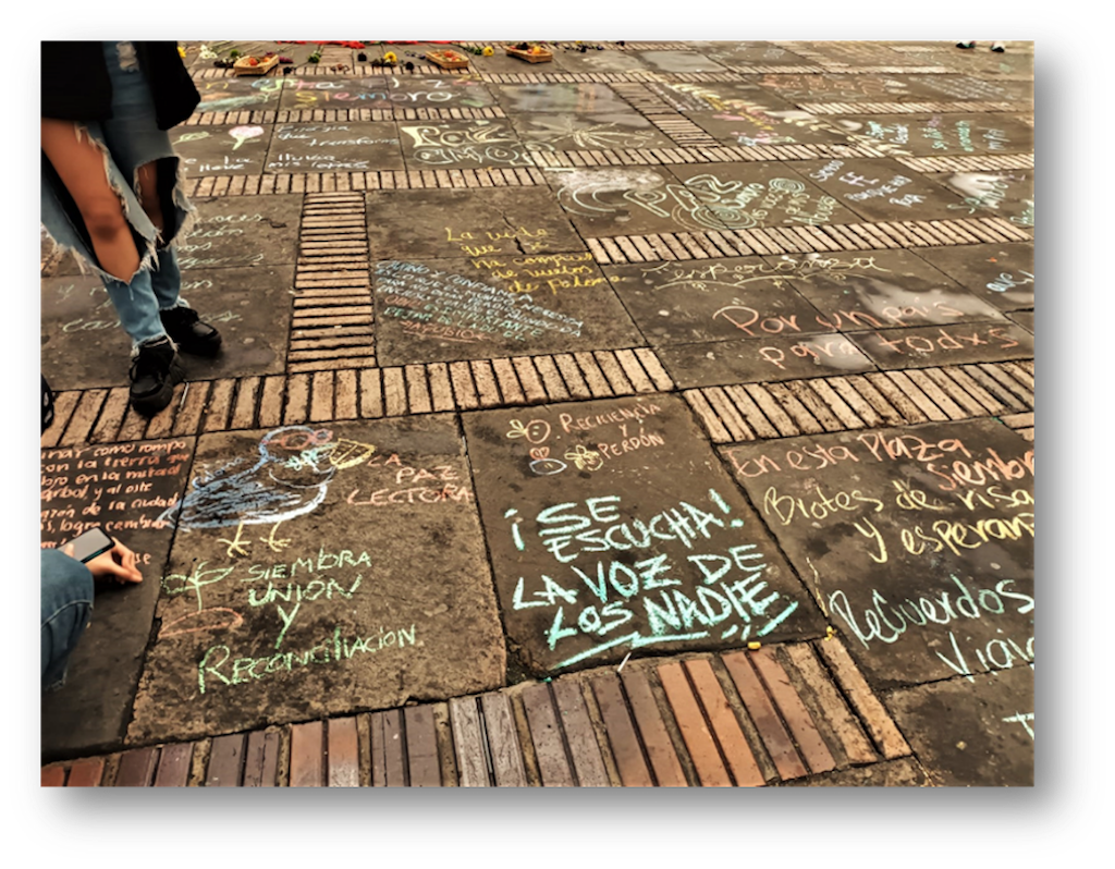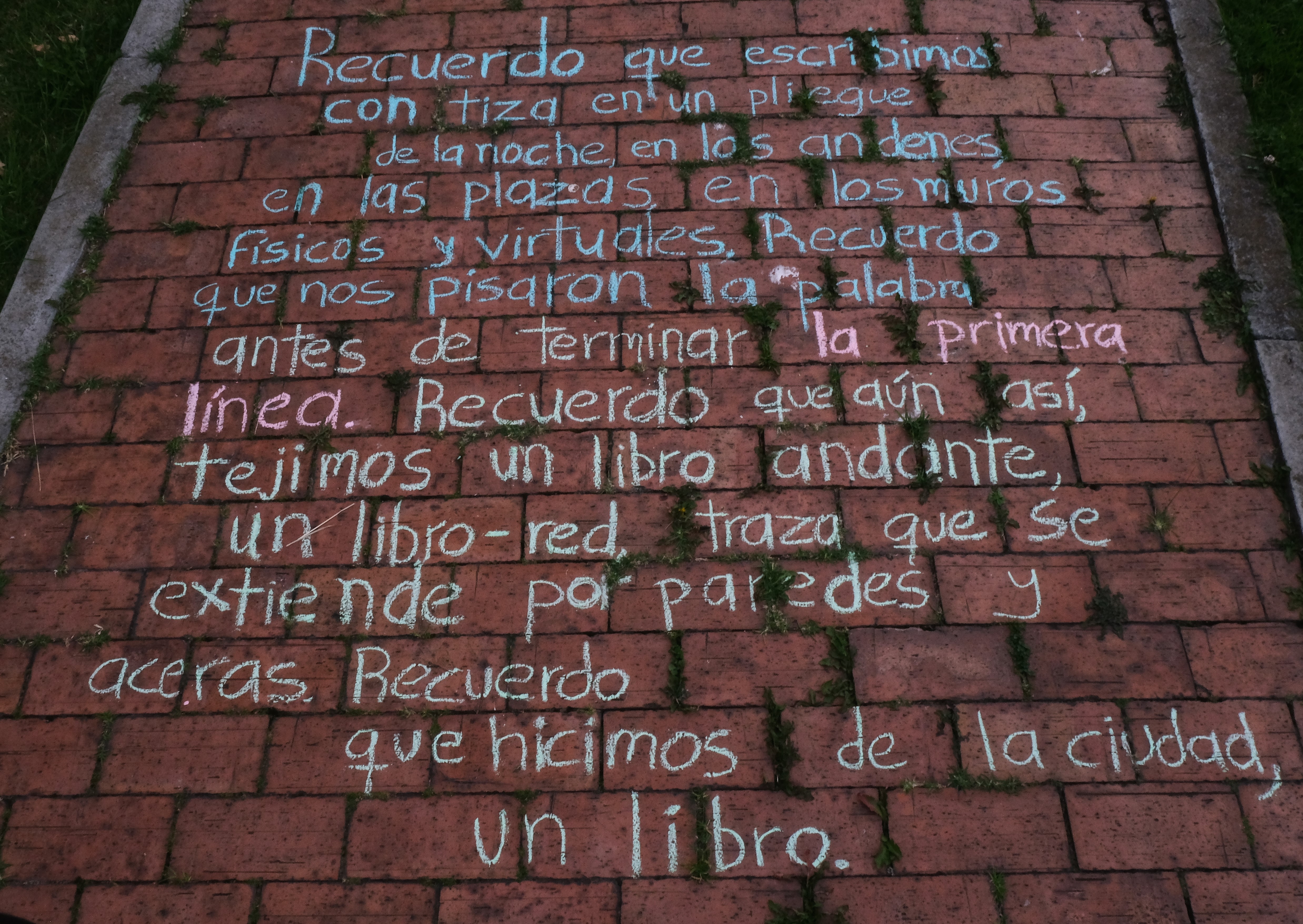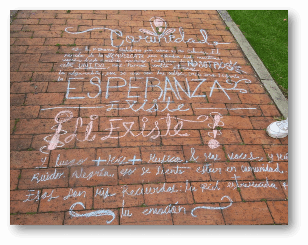 En 2021, luego de la pandemia y el estallido social en Colombia, en conexión con varios semilleros de arte de universidades públicas y privadas, vimos la necesidad de pronunciarnos con la escritura de una serie de recuerdos asociados con el estallido social. En esta ocasión se propuso un ejercicio de escritura efímera (con tiza sobre el asfalto) en pasillos del Centro Nacional de memoria histórica.