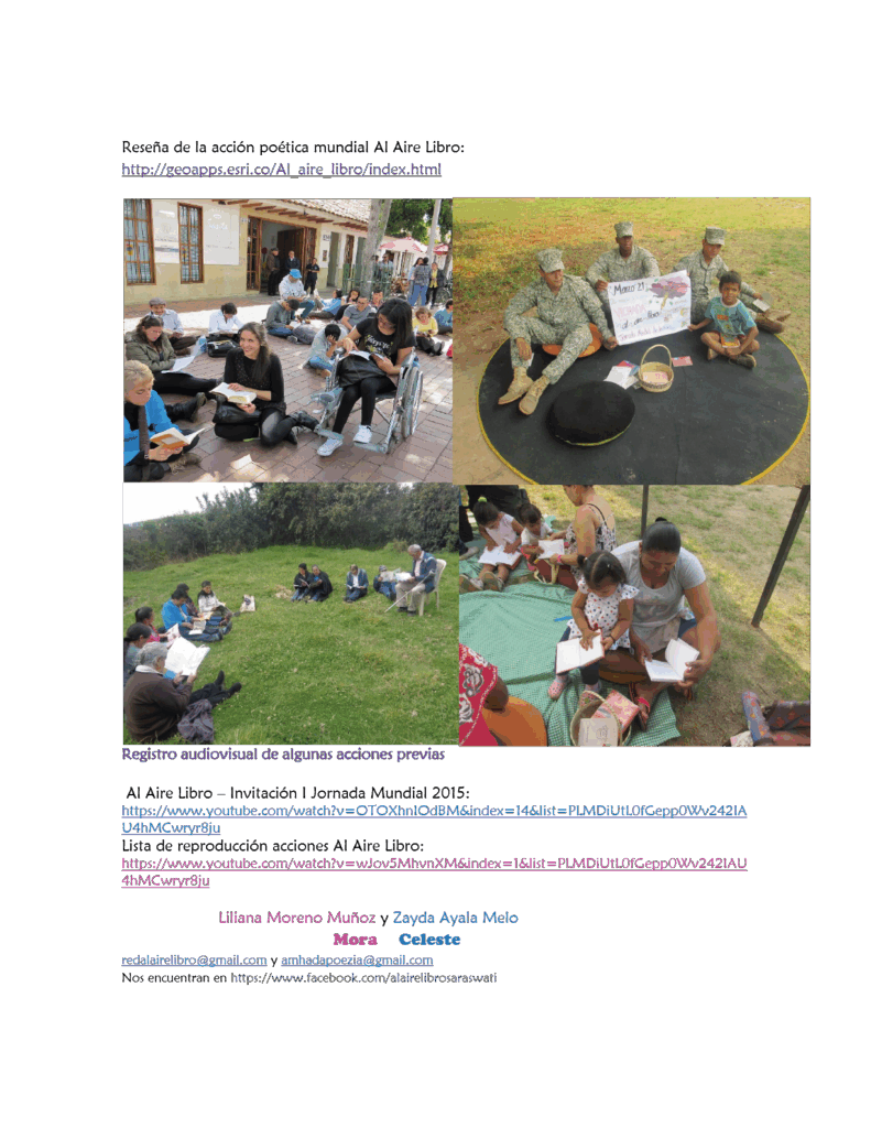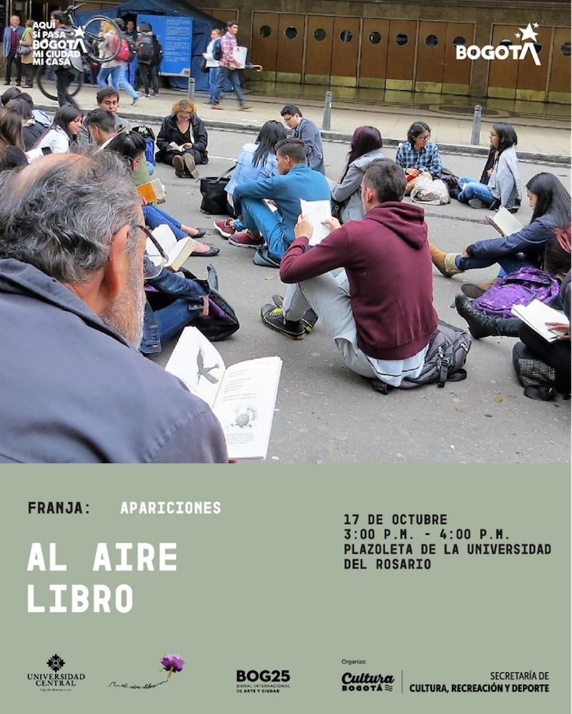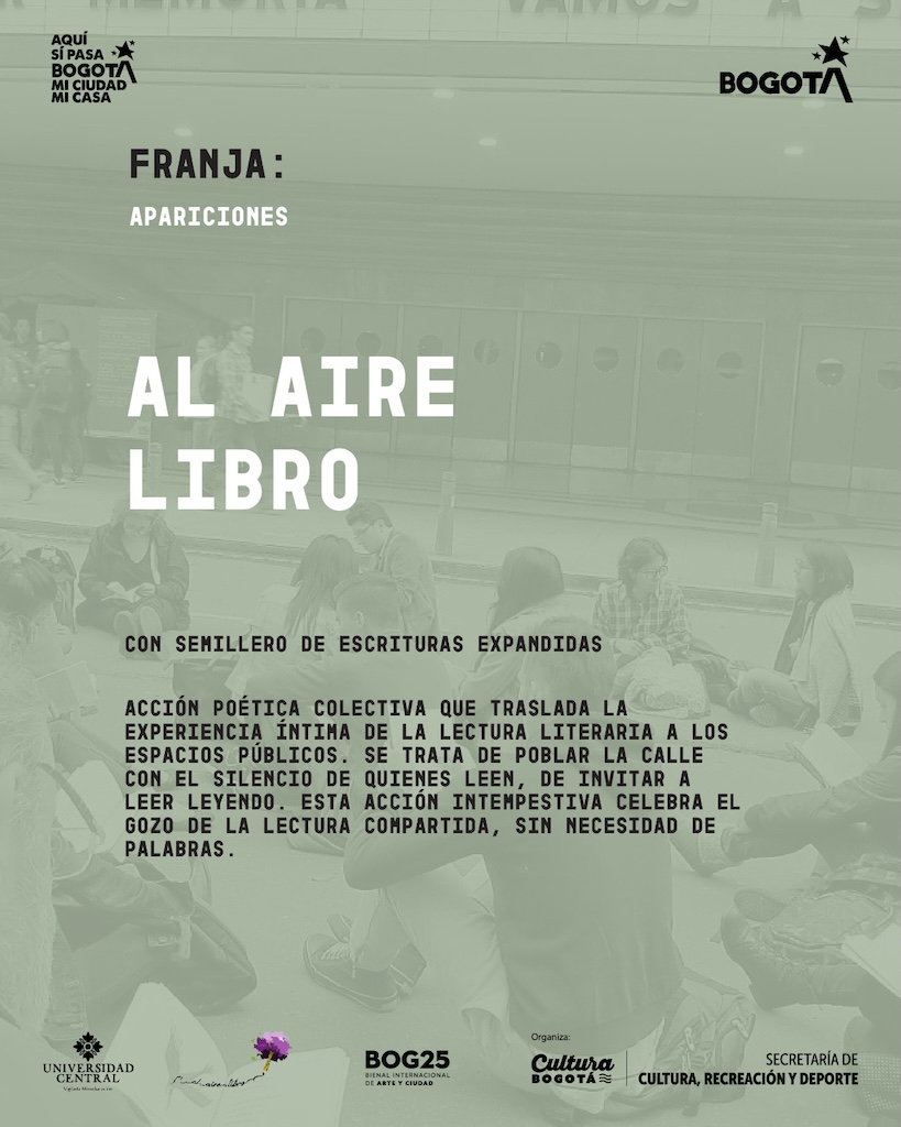 Los libros infinitos y la escritura efímera como intervención en el espacio público son ejercicios que en el momento se están preparando para ser compartidos por la red mundial de organizadores Al Aire Libro, así como escrituras colectivas que provienen de ejercicios de escucha activa en distintas localidades de Bogotá y que se viene realizando a través de grupos de WhatsApp, se trata de una propuesta contemplativa que posibilita la escritura participativa y simultánea. De esta manera avanzamos hacia la compilación y divulgación de acciones escriturales en colectivo que dialogan con los territorios y las memorias de los mismos.