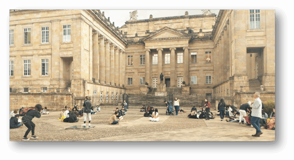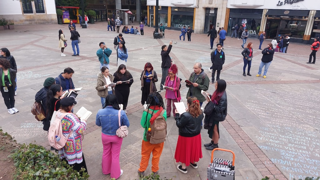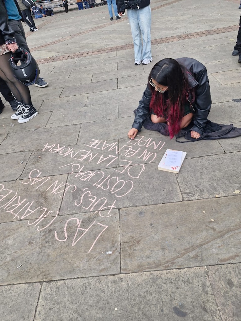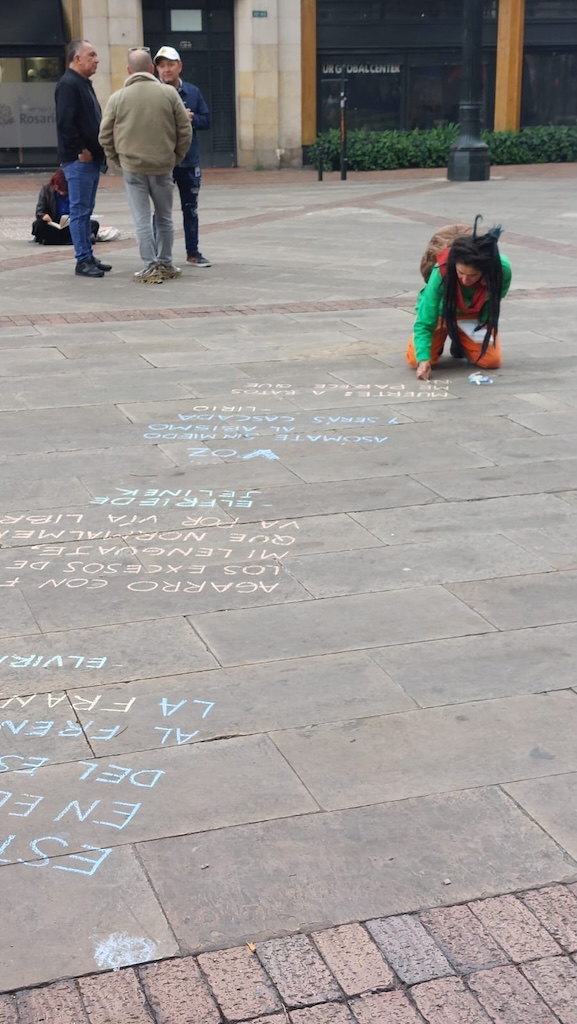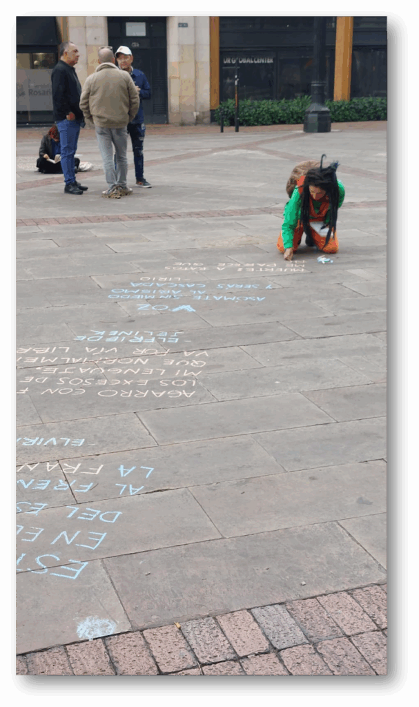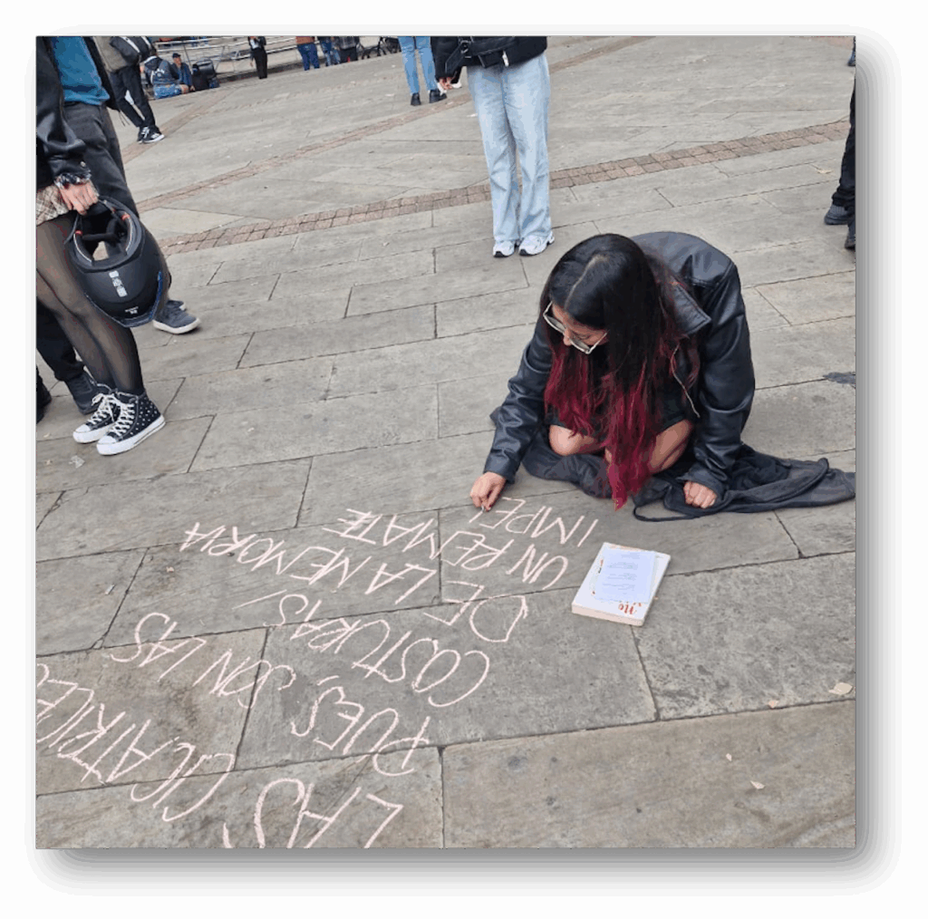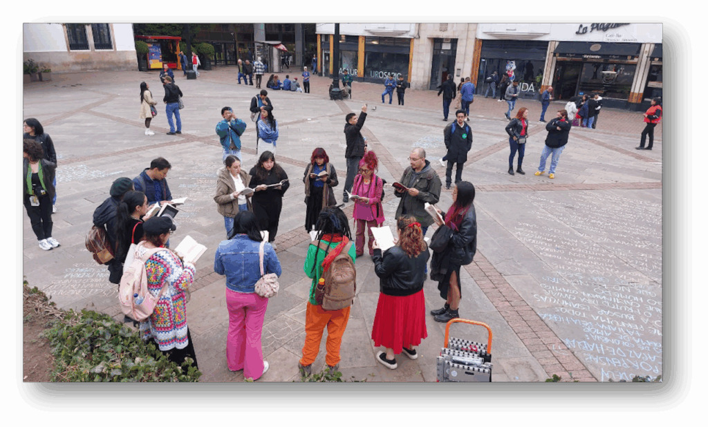 Luego de la jornada de lectura en la plaza Núñez, salimos en caminata lectora hasta la Plaza de Bolívar con la acción “Siembra de escrituras: Un pacto poético por Colombia”. En la plaza se dispuso un altar circular a partir del cual se despliega la escritura en tiza de listas poéticas sobre deseos para este nuevo país, memorias y compromisos ciudadanos.