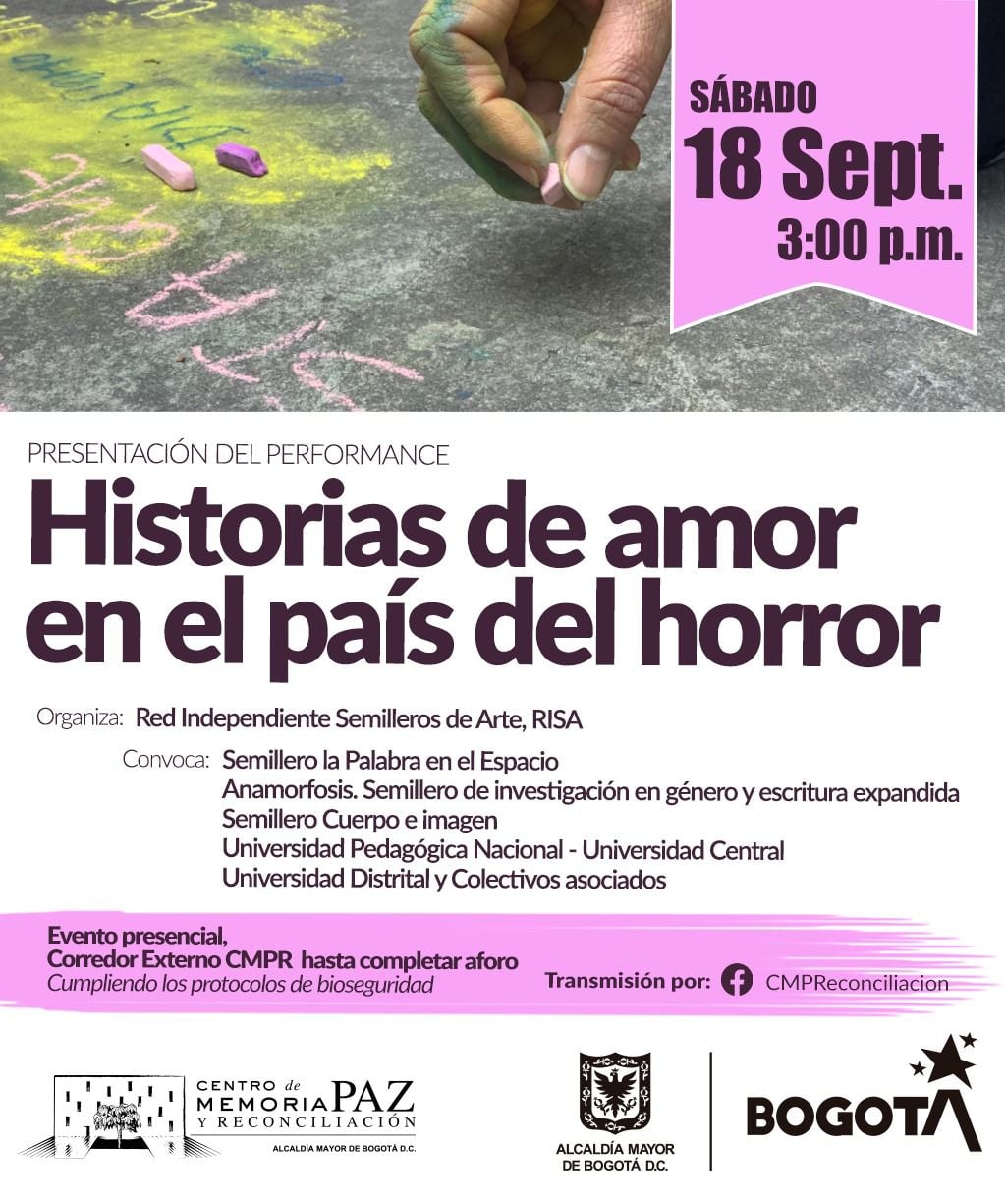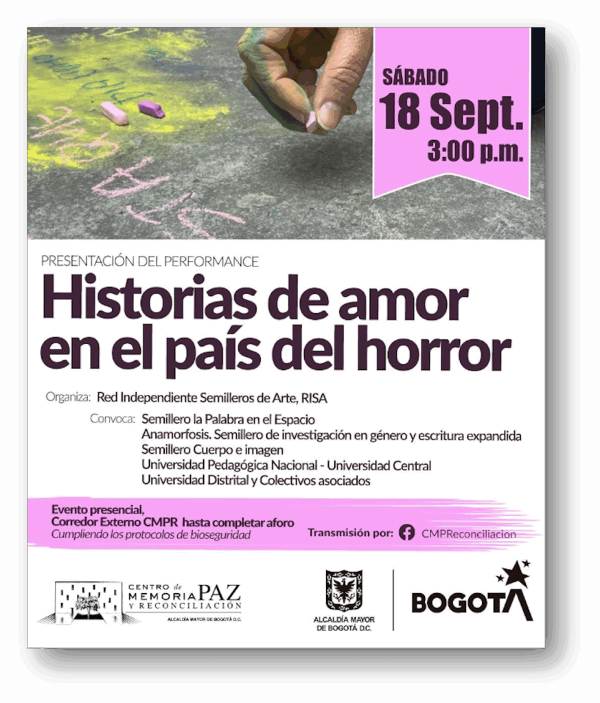 “Historias de amor en el país del horror” es el nombre de la propuesta que invita tanto a escribir recuerdos de eventos y gestos amorosos, en un sentido amplio, como recuerdos dolorosos de las vivencias asociadas a los acontecimientos de los últimos tiempos en nuestro país. Se invitó, respecto a la forma, a escribir recuerdos de más o menos cinco líneas, que inician con la expresión “recuerdo que…” siguiendo la propuesta que enlaza la obra “Me acuerdo” de G. Perec y “Yo también me acuerdo” de Margo Glantz.