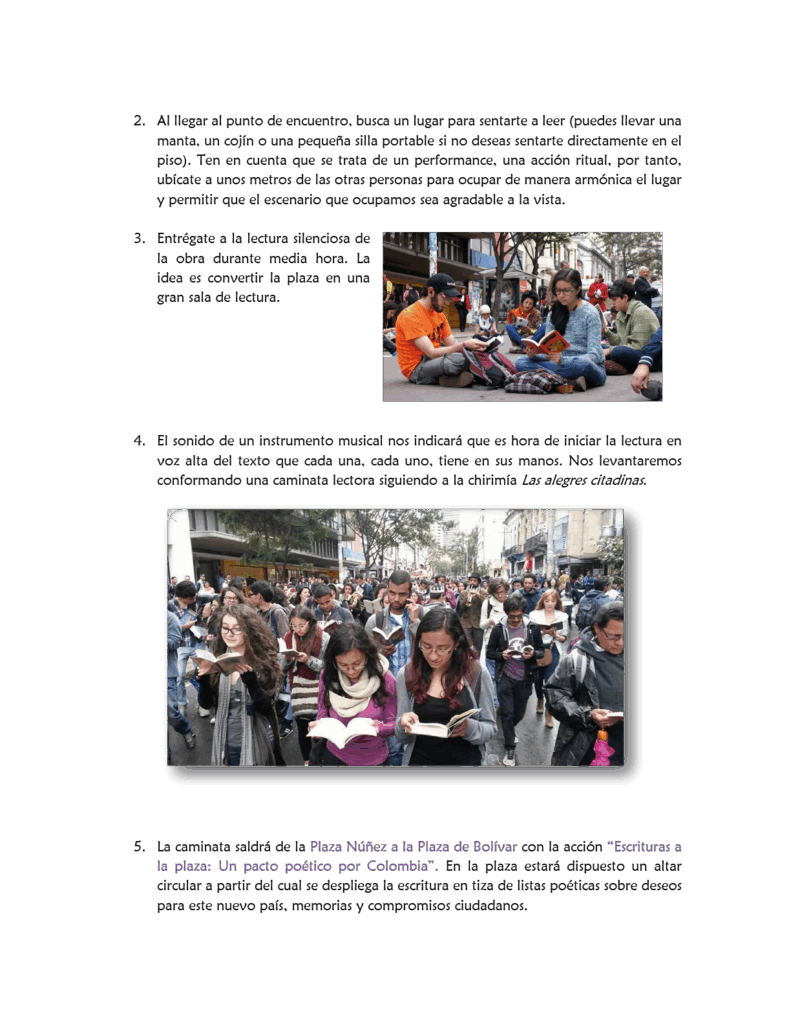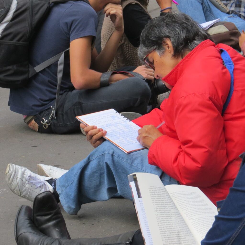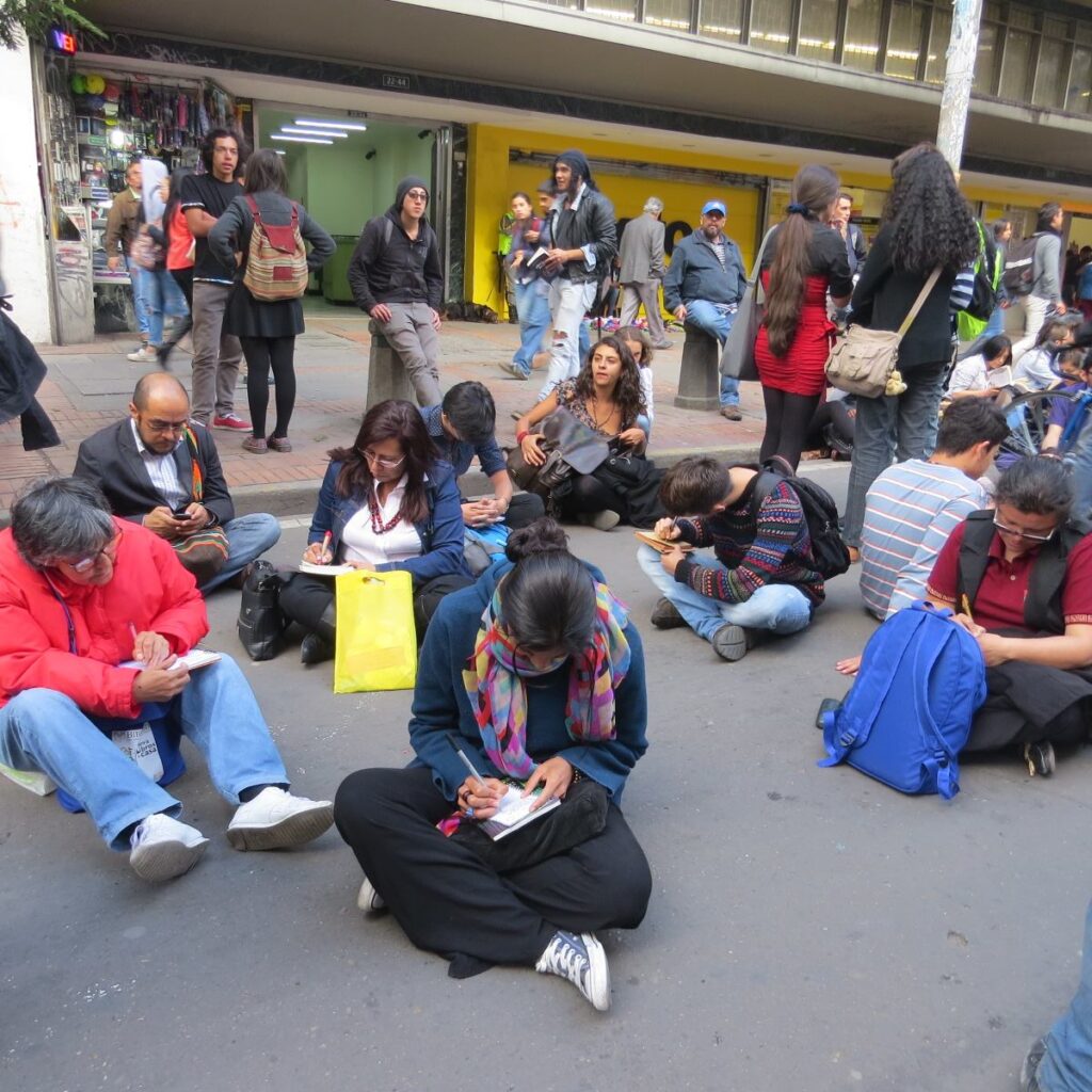 Así, nos congregamos de nuevo, esta vez, en otro punto de la Carrera Séptima (frente a la iglesia de Las Nieves) para leer en silencio durante una hora. Posteriormente, con el apoyo de una banda de música de los Balcanes realizamos una caminata leyendo en voz alta y paramos en medio del camino para ocupar la calle sentados escribiendo recuerdos.