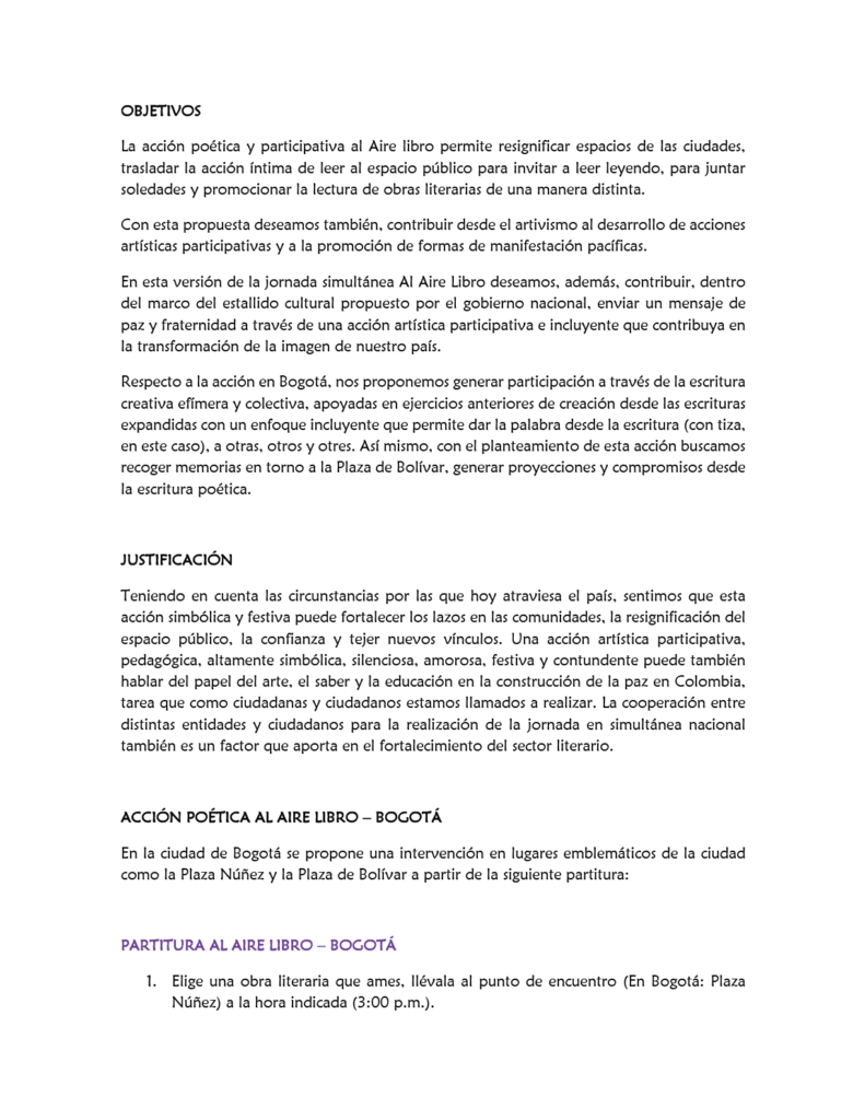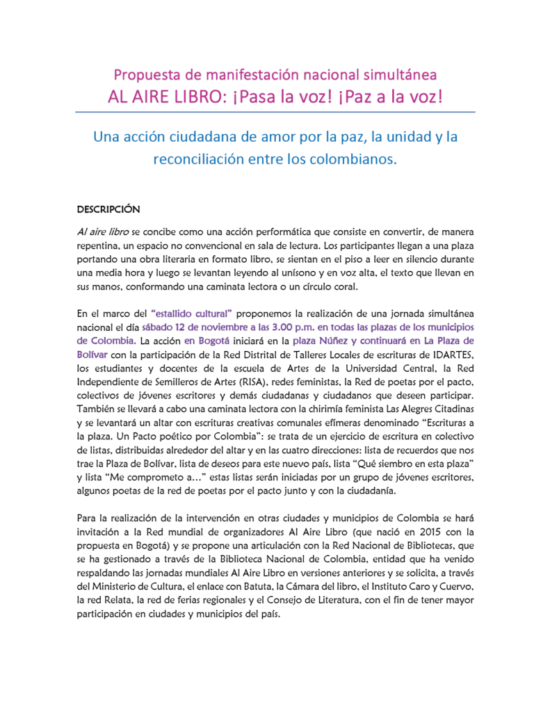Buscamos contribuir desde el artivismo al desarrollo de acciones artísticas participativas y a la promoción de formas de manifestación pacíficas. En esta versión de la jornada simultánea Al Aire Libro deseamos, además, contribuir, dentro del marco del estallido cultural propuesto por el gobierno nacional, enviar un mensaje de paz y fraternidad a través de una acción artística incluyente que contribuya en la transformación de la imagen de nuestro país.